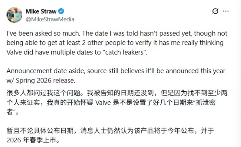 “我被告知的日期尚未到期,但由於無法找到至少兩個其他人證實這一消息,我開始懷疑Valve是否故意設置了多個日期來‘捕捉洩密者’。”斯特勞在社交媒體上坦言,“撇開公佈日期不談,消息源仍然相信遊戲會在今年內公佈,並於2026年春季發售。”
