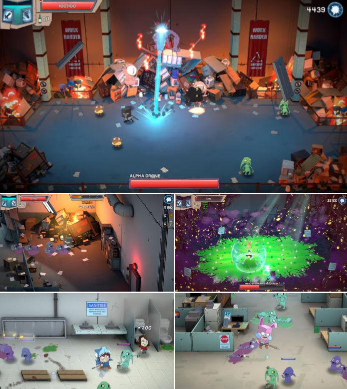 你需要一个部门一个部门地 fighting,清理办公桌和会议室,不断向塔顶攀登。你可以独自面对混乱,也可以与伙伴组队,通过沙发合作模式共同解放 workplace。你的终极目标是:抵达顶层,在与首席执行官的荣耀决战中获胜……或者战败、重整旗鼓,在下周带着更强的力量归来。