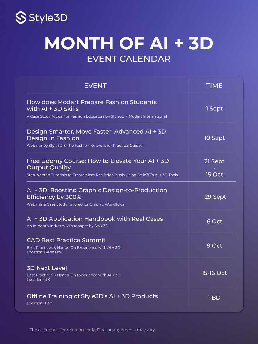 加入我们的LinkedIn Live网络研讨会,与Style3D的专家和来自梦地进出口和SOHO国际的客户一起了解他们如何使用Style3D的AI+3D技术,将打印工作流程的效率提高了三倍,从设计到生产再到营销视觉效果。