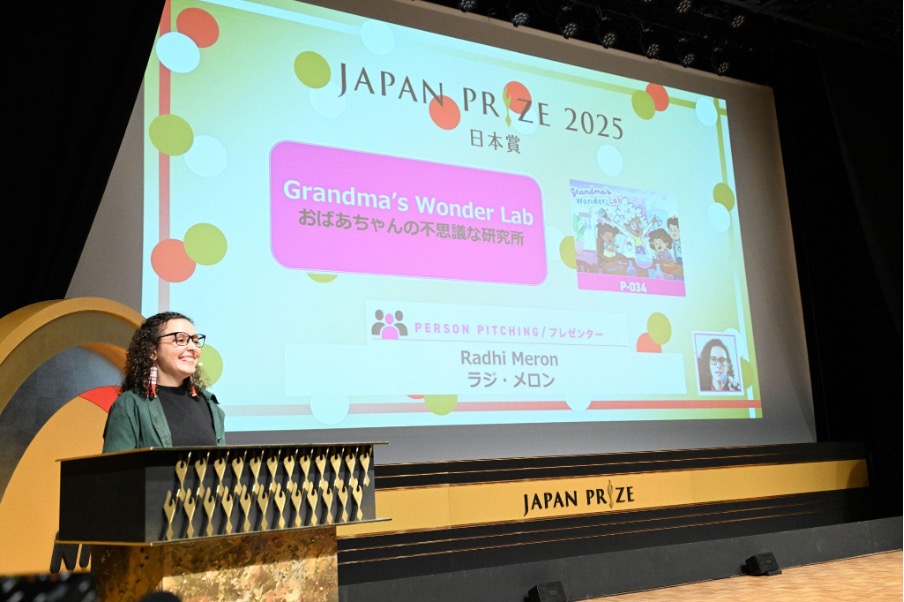 (Photo: Radhi Meron pitching “Grandma Naná’s Fantastic Lab” at the Japan Prize in Tokyo, Japan | Courtesy)