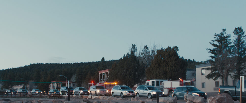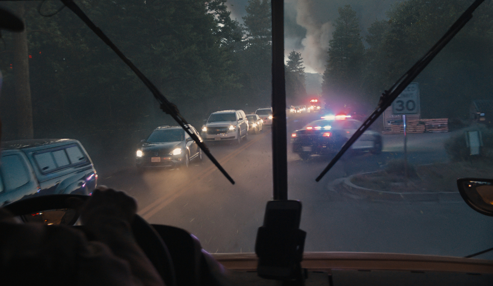 As the bus attempts to navigate to Pondarosa to rescue the children, Kevin drives through Paradise, getting closer to the fire itself. While many of these shots included the large, distant plume, our team also needed to add a strong, dangerous wind and its impact upon the town. In the original footage, anything which would be caught by the wind – trees, bushes, grass, telephone and power lines – needed to be painted out and re-animated using wind simulations before being composited back in, with CG dust and detritus whipped up from the ground. In shots with little traffic, CG cars were added to create a convincing sense of panic and exodus. As filming took place in New Mexico, buildings in had a brown tone, as well as architectural features not seen in Paradise. To fix this, colours needed to be adapted, along with signage adjustments.
