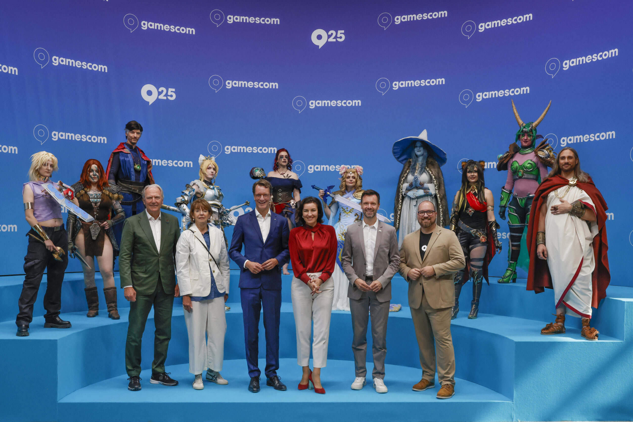 Gerald Böse, President and Chief Executive Officer of Koelnmesse, Henriette Reker, Mayor of Cologne and Chairwoman of the Koelnmesse Supervisory Board, Hendrik Wüst, Minister President of North Rhine-Westphalia, Dorothee Bär, Federal Minister of Research, Technology and Space, Felix Falk, Managing Director of game – The German Games Industry Association, Lars Janssen, Chairman of the Executive Board of game – The German Games Industry Association and cosplay during gamescom 2025 at Koelnmesse on August 20 2025 in Cologne, Germany. (Photo by Franziska Krug/game – The German Games Industry Association via Getty Images)
