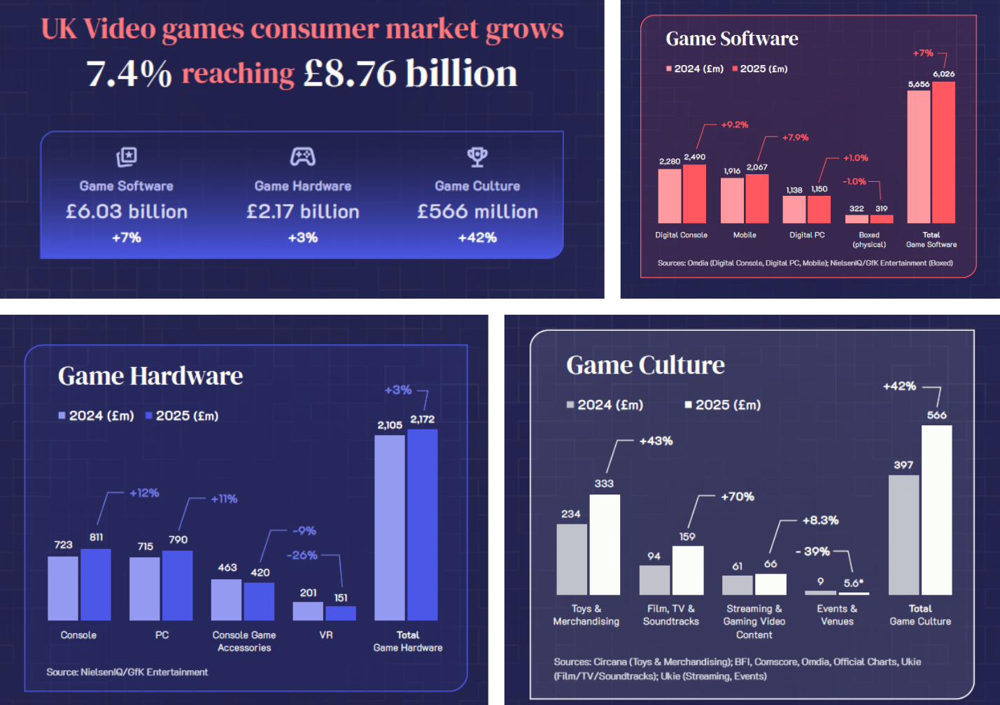 The UK video games market continued its strong growth in 2025. According to new data released by Ukie (the Association for UK Interactive Entertainment) at the start of the London Games Festival, UK consumers spent a total of £8.76 billion on video games in 2025, a 7.4% increase year-on-year, reaching an all-time high.
